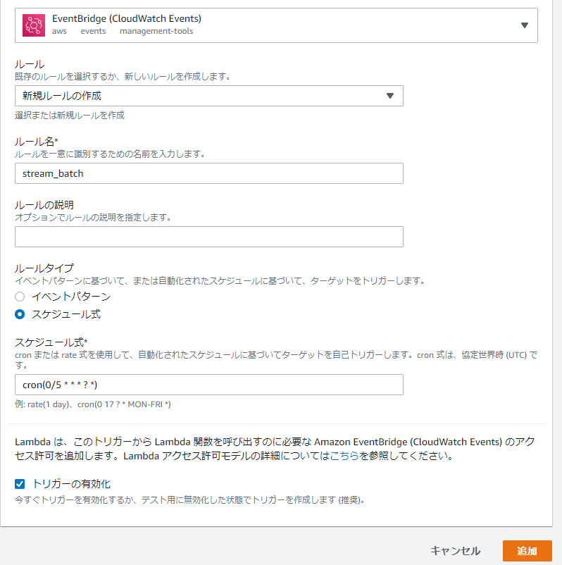 Published on2021年1月27日水曜日Lambda関数をEventBridgeでバッチ処理するAuthorsNameKikusanTwitterLambdaトリガーの設定を以下にすることで、毎日5分に一回関数が起動できる。cronまたはRateで起動時間は指定できる。Discuss on Twitter