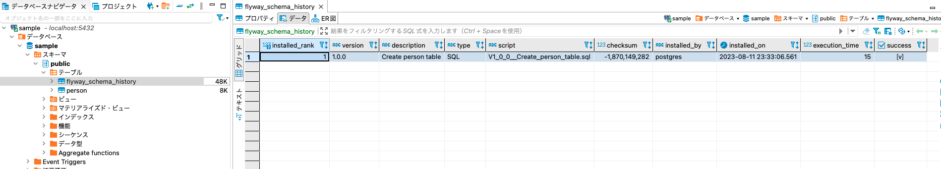 | Versioned | 1.0.0 | Create person table | SQL | 2023-08-12 00:49:12 | Success | No |